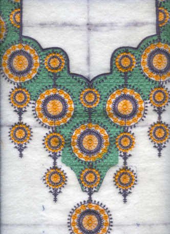 Then, hoop and embroider the first section. Within the design part, there is an outline stitch, that embroiders first. This guide line will help you center and place the next hooping. On the designs that I tried this outline stitch also fell on the center seam of the neckline. When rehooping for the next section, take the template and place it over the design, you can now fine tune the placement of the second hoop and check for accuracy. Accuracy is a must. These designs overlay from one hooping to another, not just butting up to each section. Each time you hoop a new section, part of the previous section will be in the hoop.